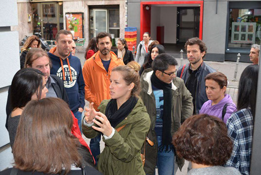 Die Gruppe versammelt sich vorm Goethehaus. Film Commissionerin Christiane Zietzer klärt die letzten Tour-Details, dann wird losgelegt!